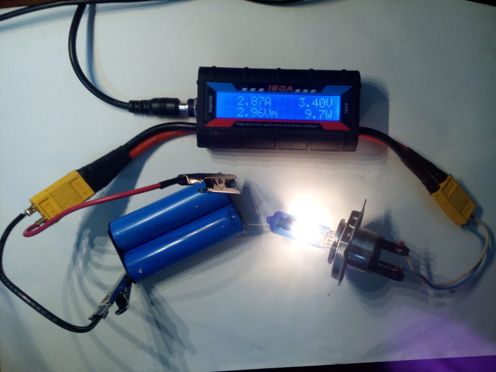 Так выглядит примитивный «измерительный стенд» для замера ёмкости аккумуляторов. Хорош он в первую очередь тем, что не имея дорогостоящего специального зарядно — разрядного устройства, можно замерять ёмкость аккумуляторов при разряде током до 50 А. Причем точность будет до 1 мА/ч. Подключая на выход нагрузку разной мощности регулируется разрядный ток. В конце разряда главное не пропустить момент при котором аккумулятор нужно отключить во избежание глубокого разряа. При этом контролировать оставшееся напряжение правильнее непосредственно на контактах аккумулятора другим вольтметром, т.к из-за падения напряжения на подводящих проводах показания на приборе будут занижены. Либо подключать максимально короткими толстыми проводами.