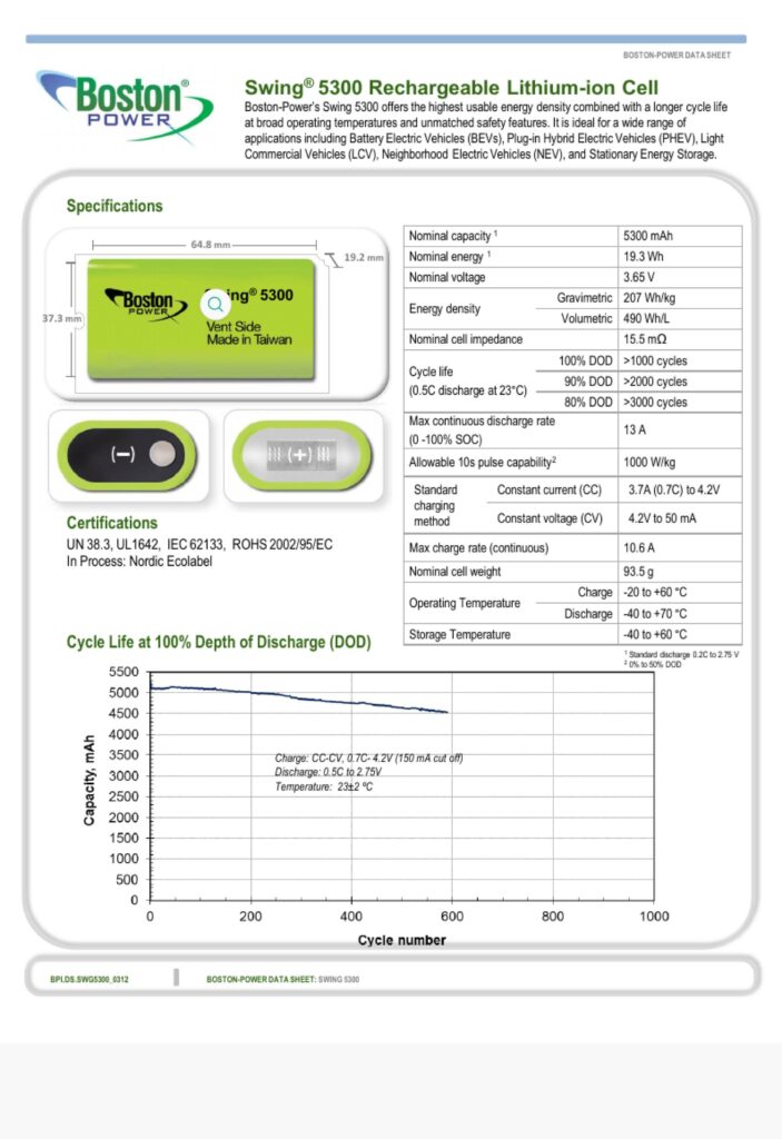 Пример Datasheet литий ионного аккумулятора Boston Power Swing 5300: