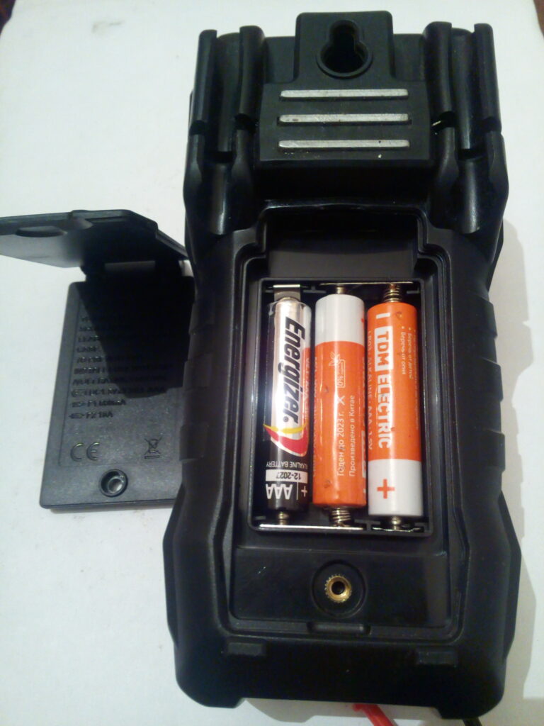 Сзади на корпусе ещё одна удобная фишка — магнит. Приборчик благодаря ему легко держится на любой железяке. Удобно при работе с авто или когда лазишь в электрощите.
