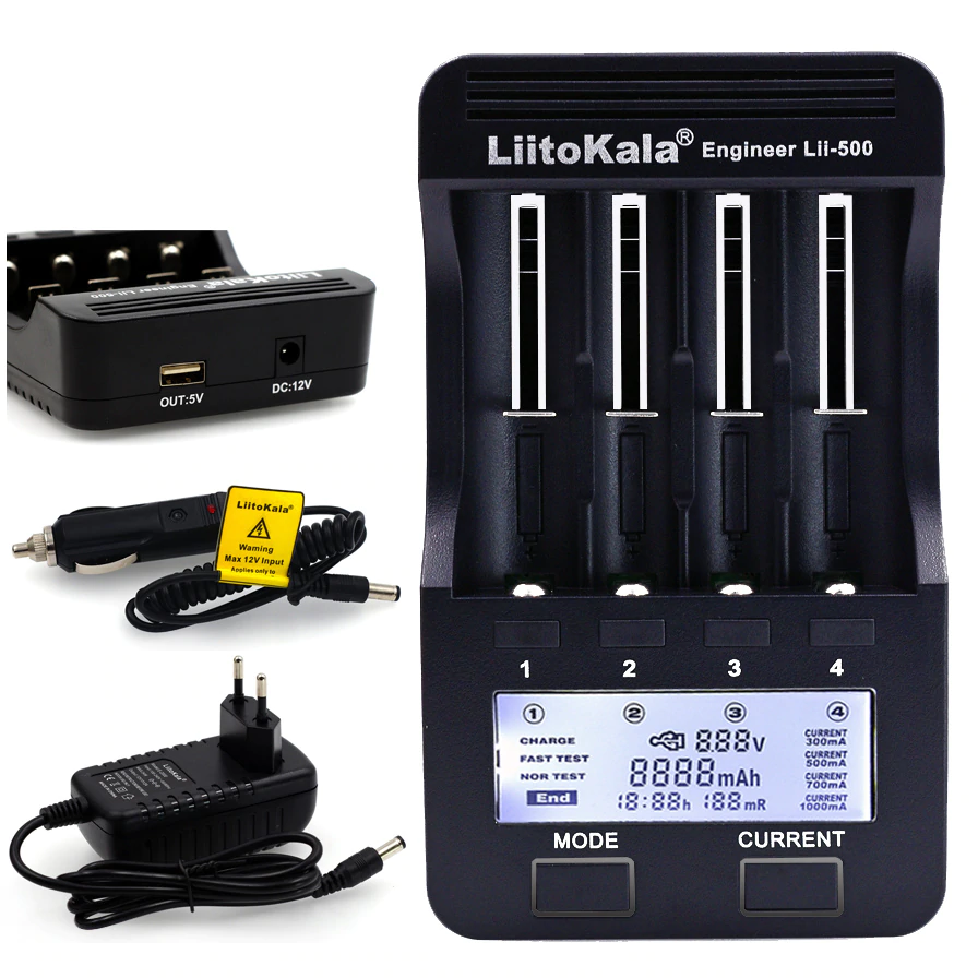 Зарядное устройство Liitokala Lii-500 подойдет для Характеристики Режим Charger (Заряд). В течение восьми секунд выбрать силу тока заряда 300, 500, 700 или 1000 mA. В процессе заряда подсчитывается залитая в аккумулятор ёмкость. При завершении процесса на дисплее появляется слово “End”. Режим Fast Test (Быстрый тест). Разряд-заряд. В течение восьми секунд выбрать силу тока заряда 300, 500, 700