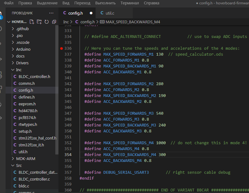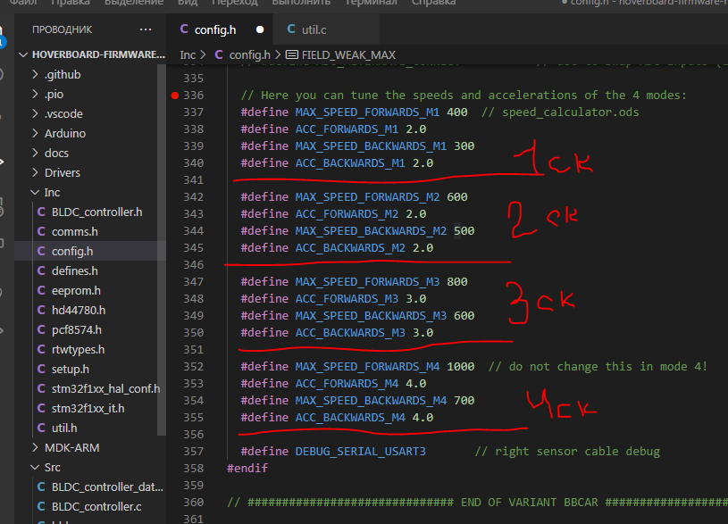 Многим уже известная прошивка гироскутера «ховеркар» от EFeru, отлично подходит для самодельного электротранспорта с использованием курков и педалей. С ним всё прекрасно, но он имеет одну скорость. В некоторых случаях требуется несколько скоростей (передач), особенно для детских проектов электротранспорта, когда претенденты порулить разной массы, возраста и имеют разный опыт вождения. Larsm разработал вариант кода «бибикар» под 4 скорости. Выбор требуемой скорости реализован с помощью курков (педалей) газа и тормоза. Моторы работают в режимах без свободного наката, но для детских проектов это скорее преимущество, чем недостаток. При сбросе газа транспорт плавно остановится а не укатится вместе с неопытным водителем.