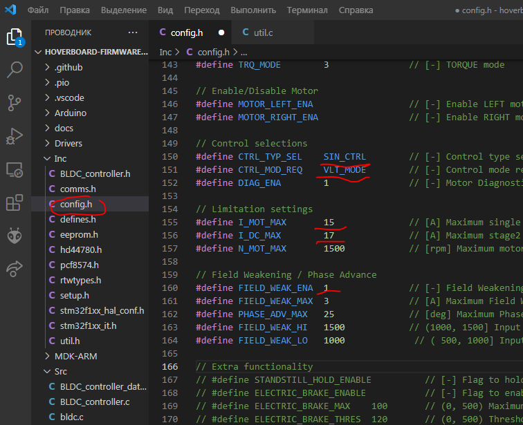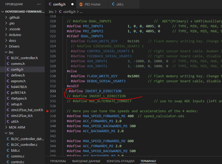 По умолчанию в разделе нет строк для инвертирования колес, но можно их скопировать например из раздела «ховеркар» и вставить как на картинке ниже (в примере инвертирован правый мотор). Для активации убираем // в начале необходимой строки.